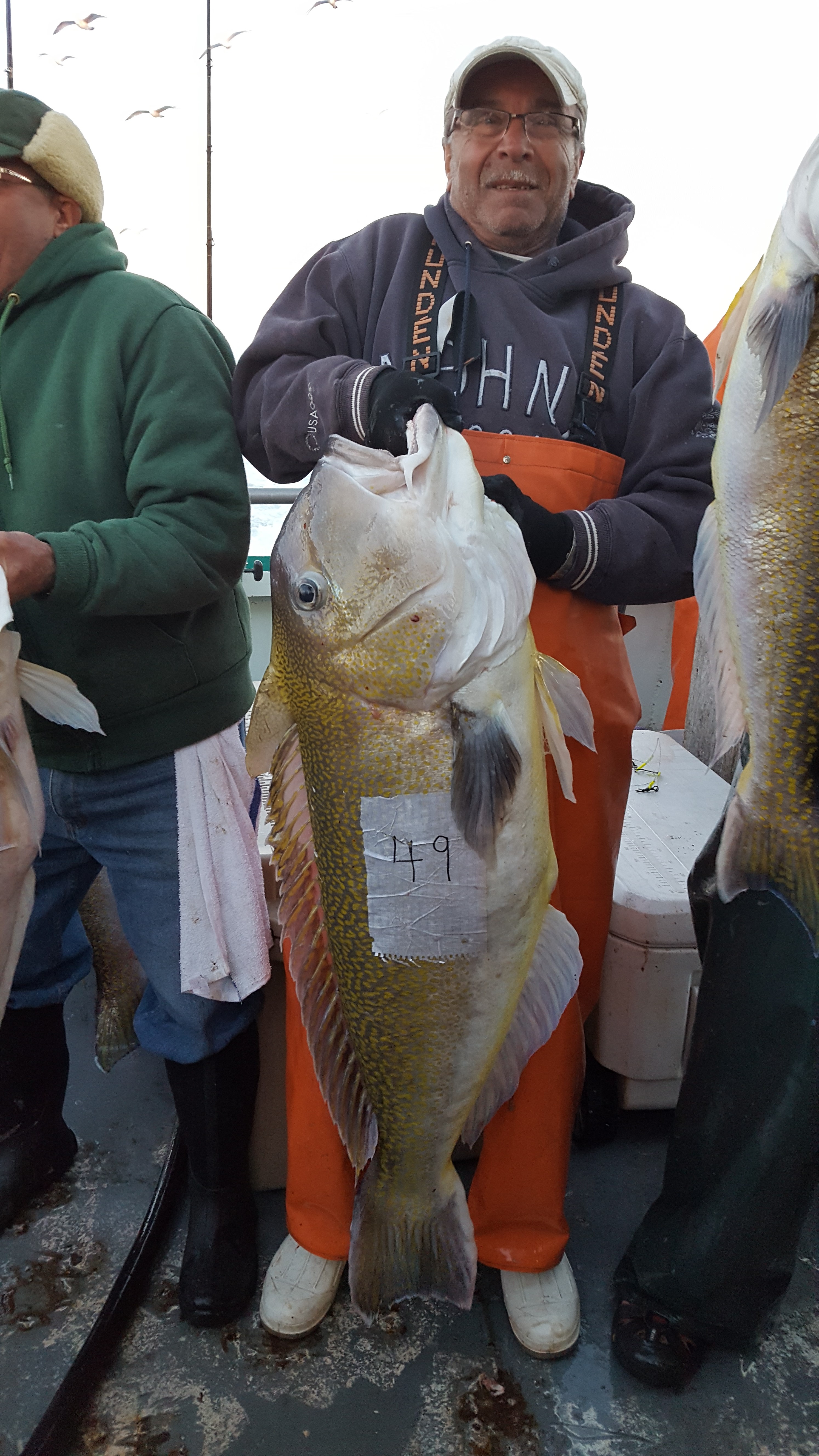 Capt Steven Sr reports that we started out slow with the moon tide from the east and the wind from the south where the drift was not favorable. We found fish here and there with some good drifts and some slow ones. There were mixed size Tile from kitten’s to large and we also had a few Hake in the mix as well. After Day 1 some guys had 15 fish and some guys had 2. Some were hot and some were not! Day 2 we started on some deep water wrecks only to find they were un-fishable due to sea bass. There were 4 to 6 pound sea bass in 420 feet of water with some Pollock mixed in. The Sea Bass took over so we moved to open bottom to find a pick of Tile and Hake. I decided to put a liitle more effort in and it was worth IT! We found LG, XLG, and XXLG Tiles, Hake and XL Cusk. It was Awesome!! Duane Sherard had 3 Tile Fish at 29, 33 and 38. Pete Ferguson had full coolers both days with two 30 pounders. Bruce and Barry Brandow had full coolers both days with a 32 lb and a 35 lb Tile. Mike Xenakis had a 42lb and 49lber. Brian Martin landed a 34lber and 37lber. It turned out to be a very good trip. Capt Steven Sr, Capt Dave, Steve, Gator, Debbie and Justin want to thank everyone for all of their support on these Explorer Trips.