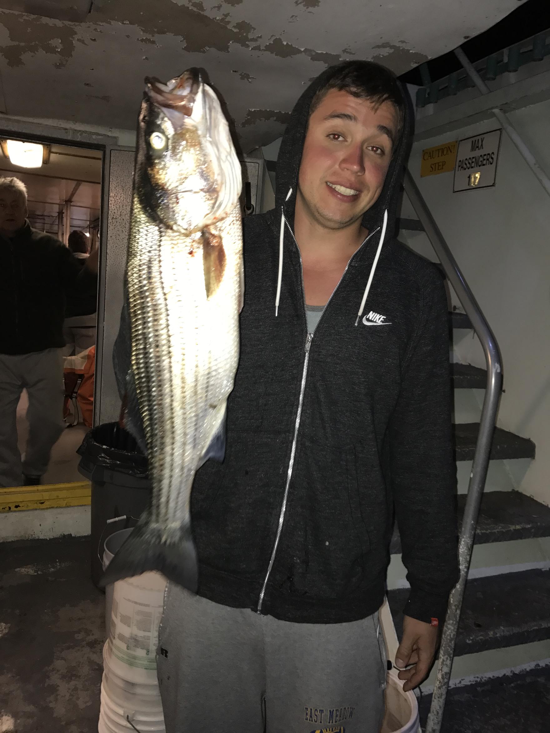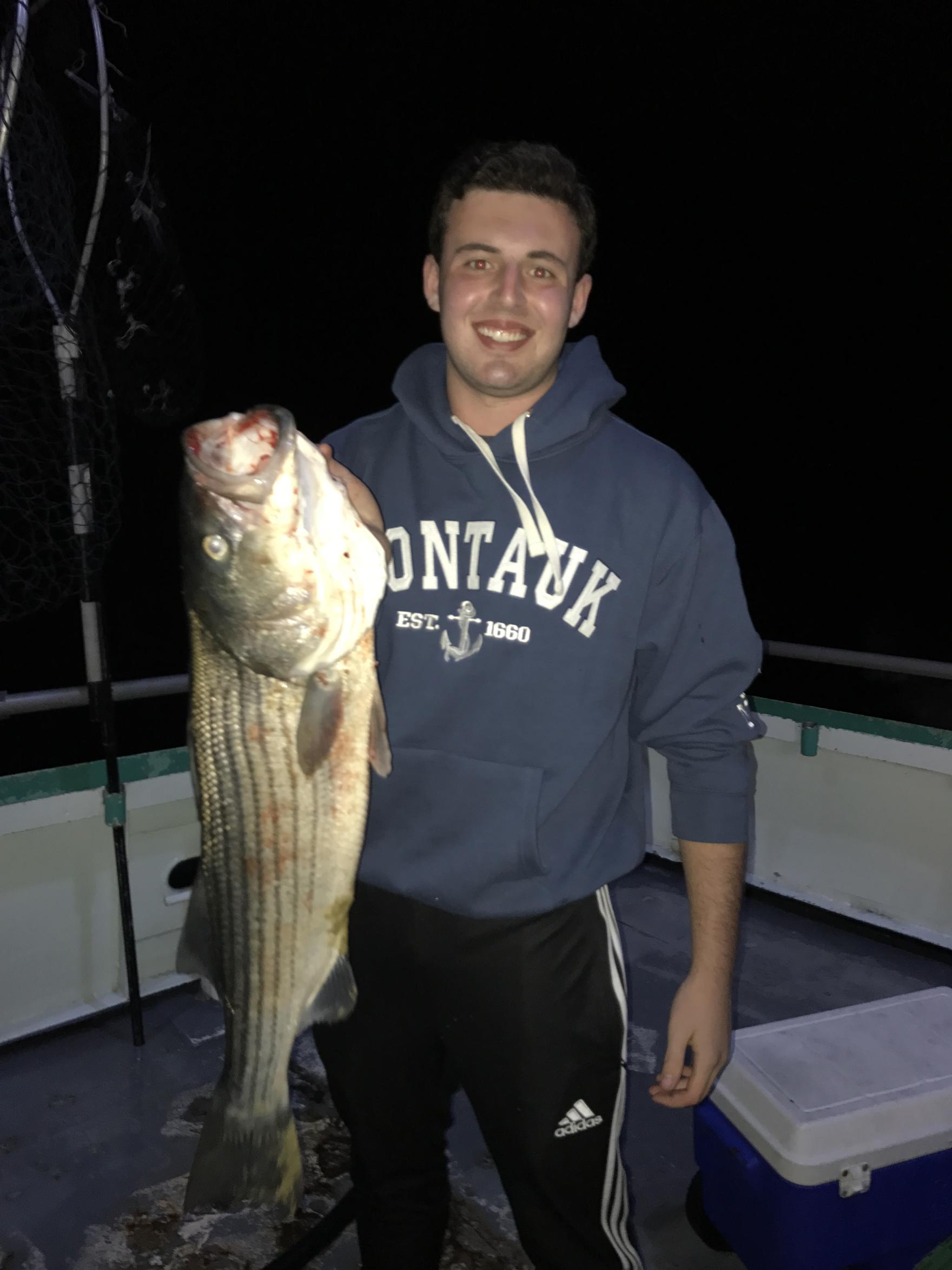 Capt Carl reports some Striped Bass were caught on tonight’s trip! All the action was before sundown, with some keeper bass caught on both jigs and eels, with jigs out catching the bait. Once it got dark, we never got another bite, but for the early start to the season, we were happy to see some stripers brought aboard the Viking Starship! Mitchell Sloane from Larchmont, NY took the pool with an 18 lb Bass.