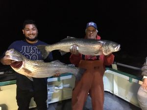 Capt Carl reports MUCH improved Striped Bass fishing on the Viking Starship tonight. We had much better conditions and that equals much better fishing. Diamond jigging tonight was excellent, with many keeper Striped Bass, many throwbacks, and many big gorilla blues as well! Once it got dark, we had to wait for the tide to change, but once it did, they started biting again! It was definitely a smaller cull of fish than we have been seeing, but we did have a couple decent ones as well. We picked away and ended up with our boat limit of Striped Bass so everyone onboard got to take home a delicious Bass! Gary Young took the pool with a 28 pounder!