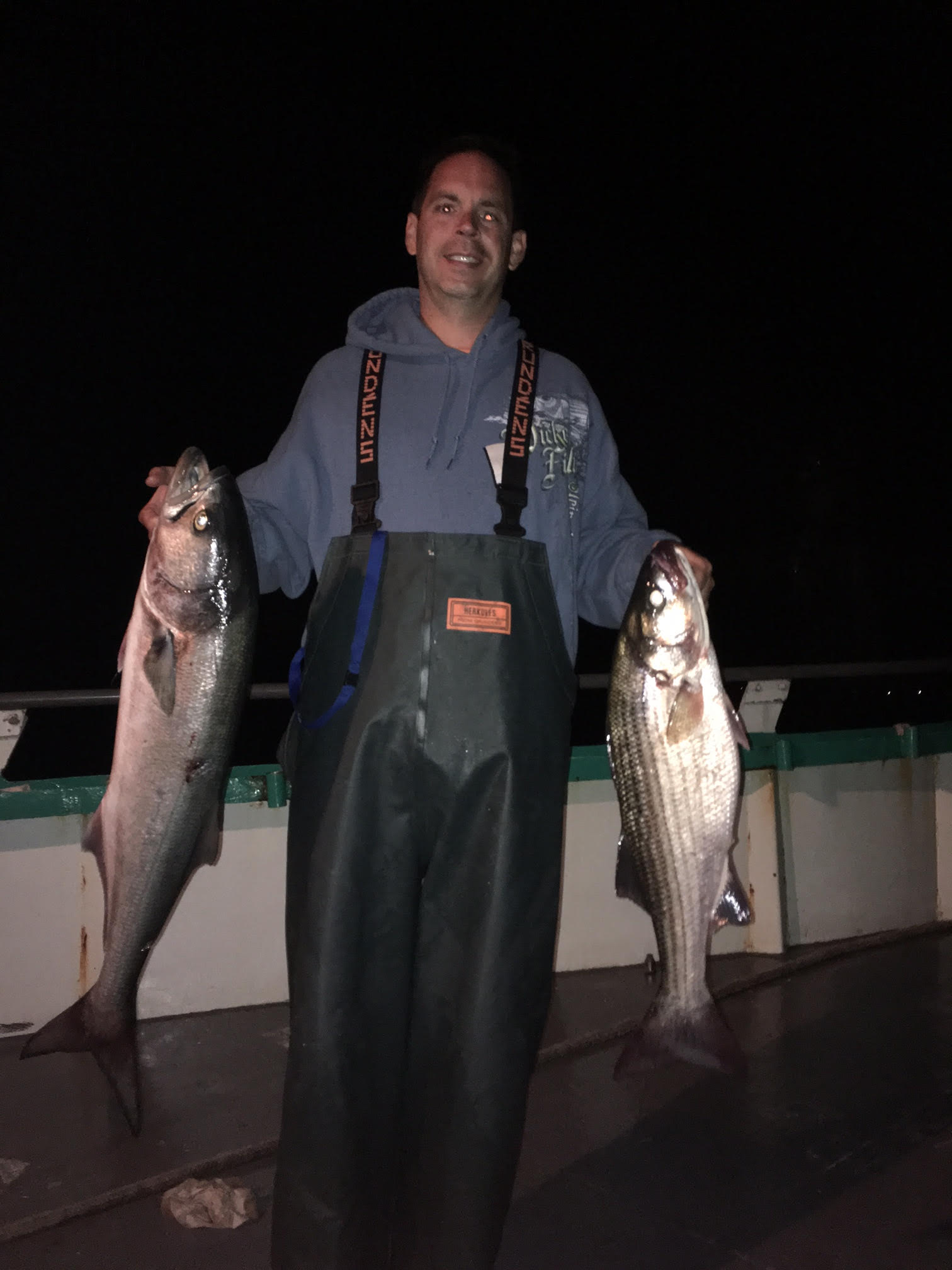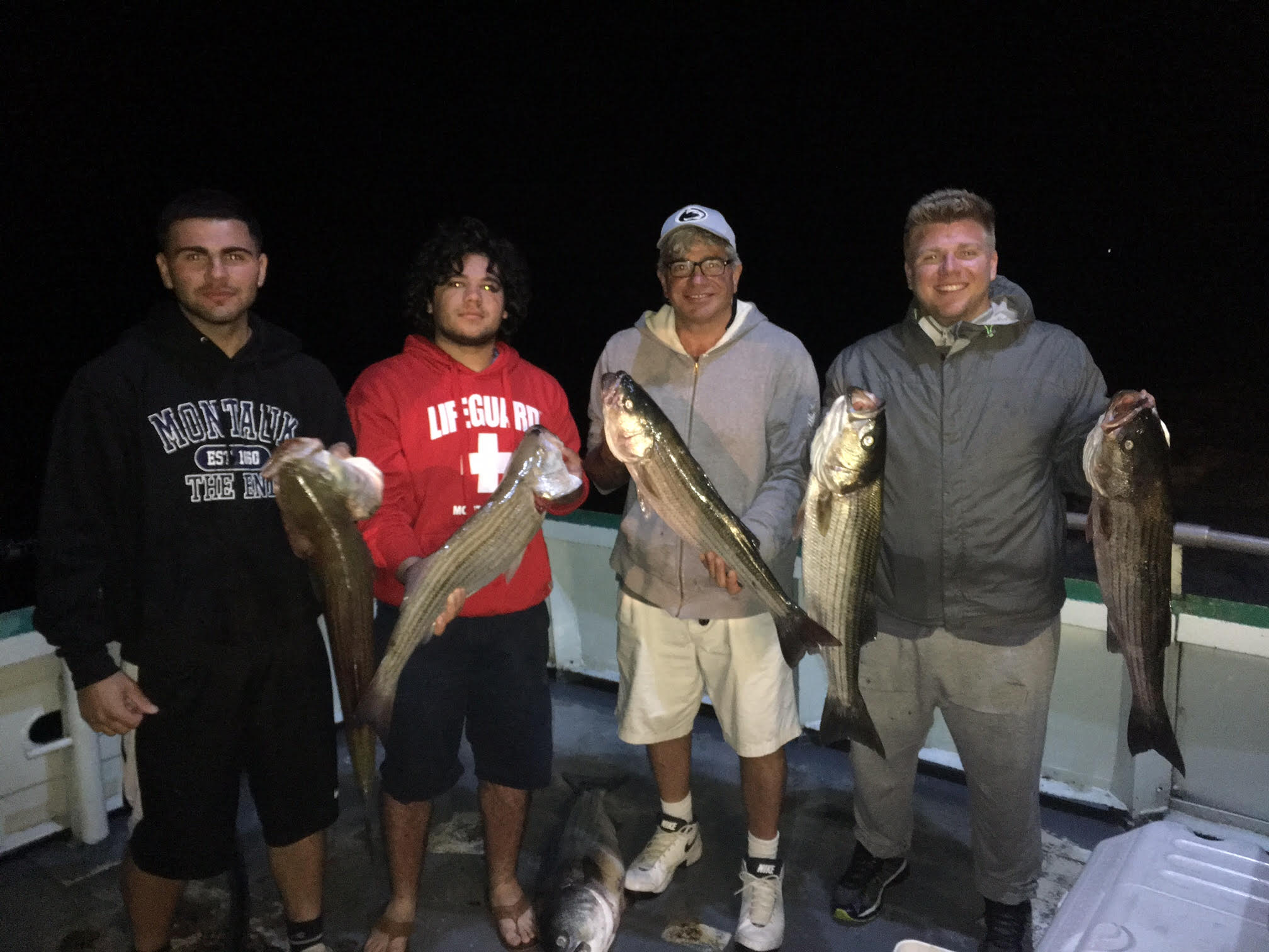Capt Carl reports MUCH improved Striped Bass fishing on the Viking Starship tonight. We had much better conditions and that equals much better fishing. Diamond jigging tonight was excellent, with many keeper Striped Bass, many throwbacks, and many big gorilla blues as well! Once it got dark, we had to wait for the tide to change, but once it did, they started biting again! It was definitely a smaller cull of fish than we have been seeing, but we did have a couple decent ones as well. We picked away and ended up with our boat limit of Striped Bass so everyone onboard got to take home a delicious Bass! Gary Young took the pool with a 28 pounder!