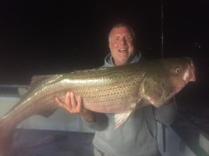 Capt Carl reports another Excellent night of Bass fishing with another full limit of Striped Bass harvested! We started off seeing a giant pile of fish on the surface splashing like crazy and feeding on bait so we stopped and caught tons of giant gorilla bluefish which was very fun and exciting. After loading up quickly with them, we continued on to the Bass grounds where when we arrived, the flood tide had just started and we started catching Striped Bass! All night we saw steady and consistent action with Striped Bass ranging from 30 inches to over 40 pounds! We ended up with our limit of Striped Bass and Mitch Parasehiv from Nesconset, NY took the pool with a 42 pounder!