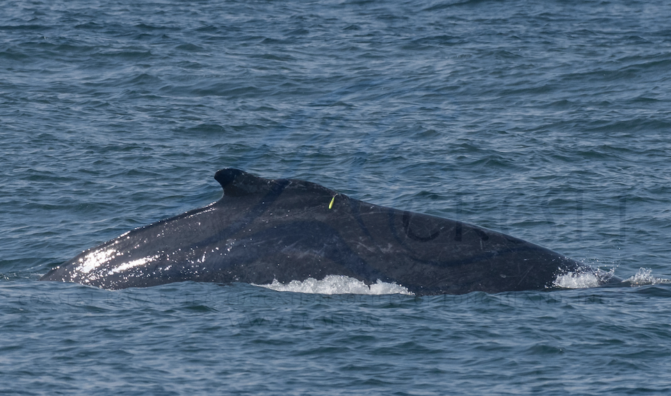 Once again, we left the sweltering heat and cooled off almost immediately after leaving the harbor (sea surface temperatures have been in the upper 60’s to low 70’s for a while). We headed towards an area where dolphins had been seen earlier, but they had move on, as nomadic dolphins almost always do. We then headed off towards one of our known whale feeding areas, and there we encountered 2 large humpbacks swimming, diving, and obviously feeding together, we also see a small pod of bottlenose dolphins. We see a third humpback. The 3rd whale heads North and we stay with the pair. Their prey are in bands from the surface to 50′ below, and they’re spending feeding below and occasionally defecating at the surface. One of the whales is a known whale from the Gulf of Maine, Komodo, the 2007 calf of Rune, the other remains to be identified.