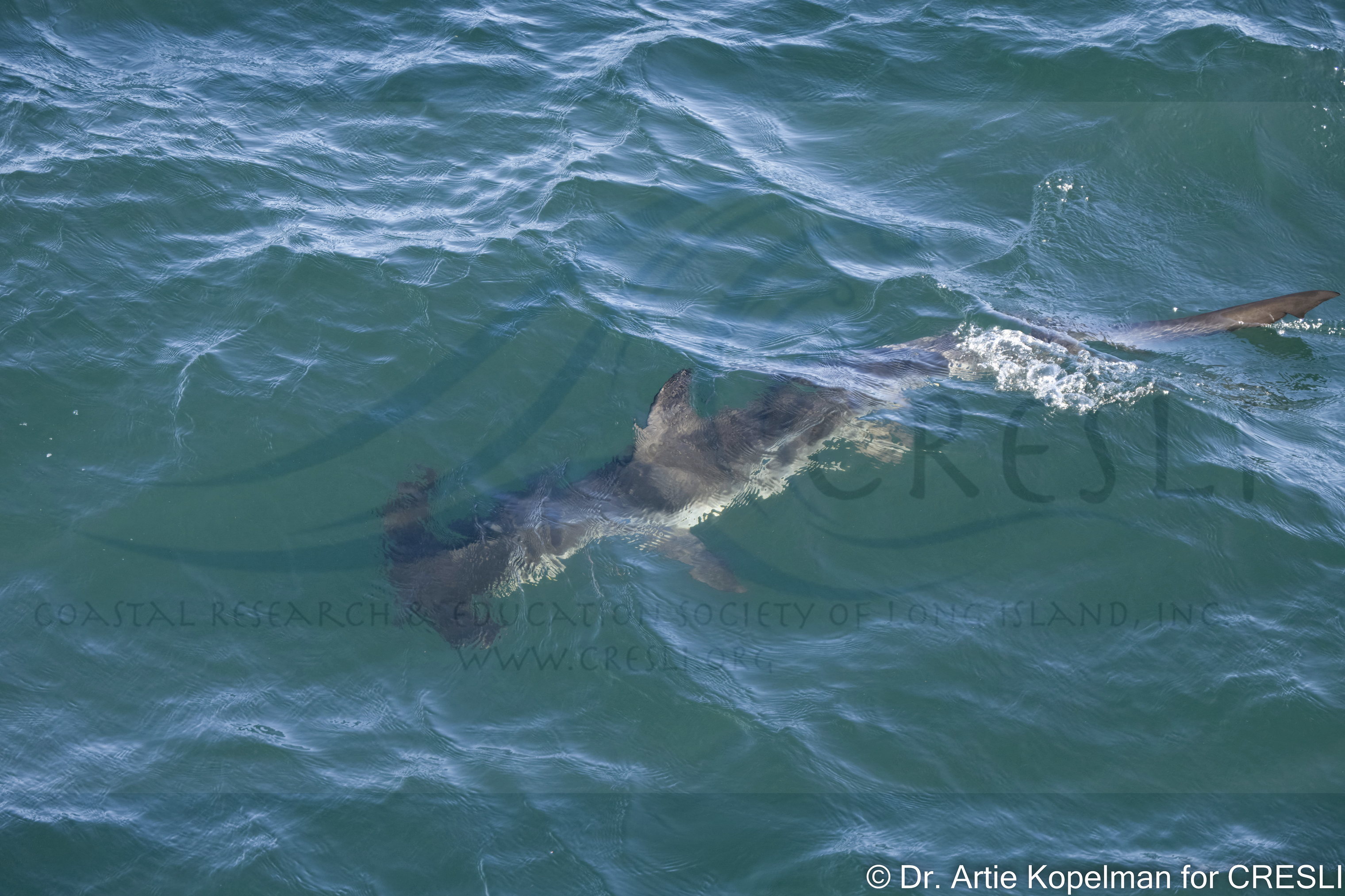 It was a bouncy ride for our first hours, but we enjoyed being away from the heat and being out on the ocean looking for wildlife. Pelagic birds flew around us most of the trip (Cory’s, Scopoli’s, and Great Shearwaters). We found what was most likely a loggerhead sea turtle, but never had great looks at it. Right after the turtle, we found the first of several small pods of inshore bottlenose dolphins feeding on prey at the surface and continued to search for whales. A beautiful smooth hammerhead shark swam on our starboard side just feet away from us. We had amazing views. Ultimately a humpback breached in the distance ahead of us. It was one of the humpbacks we’d seen on our last trip. We began to see more and more humpbacks around us, and were ready to go to them. Unfortunately, a passenger experienced a serious medical issue and we had to head to the dock and meet EMT’s. As much as we wanted to see more whales, the health and safety of people onboard take precedence. As we headed towards the Lighthouse, dolphins came swimming towards us from all over.